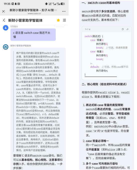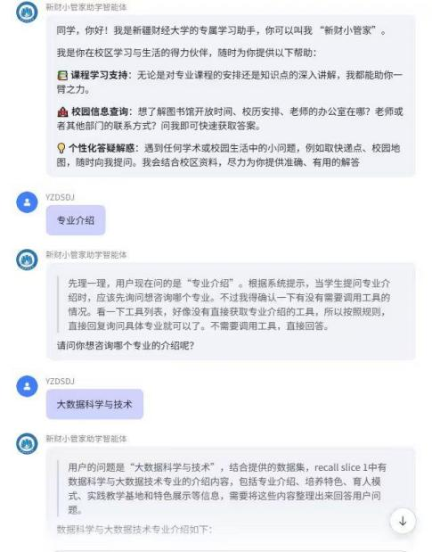 “新财小管家”AI 智能体能够解决课程学习、校园信息查询、专业课程问题答疑解惑等功能,具体如下: