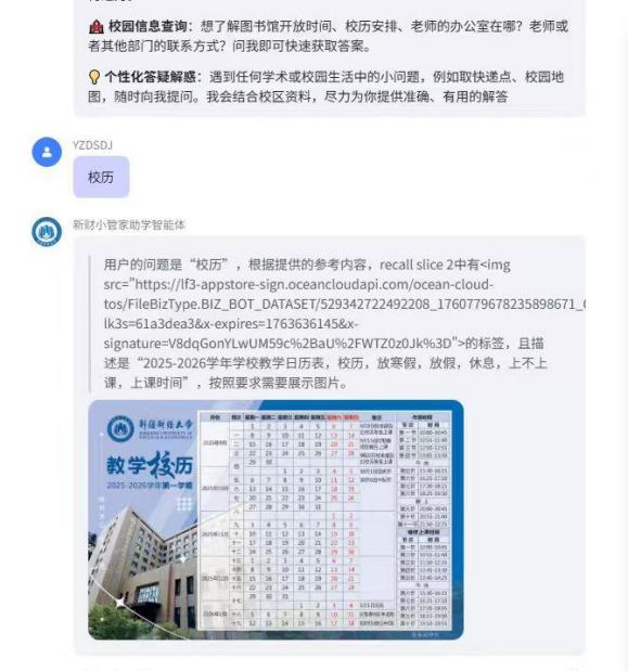 “新财小管家”AI 智能体集成自然语言处理、知识图谱等技术,搭建覆盖“课程学习、校园信息查询、专业课程问题答疑解惑等功能”的全场景的校园服务系统框架。已完成核心功能测试,验证系统可精准识别校园服务类问题(语义理解准确率达 95% 以上),能解决校园服务中“课程学习,专业课程问题答疑解惑,信息分散难查询、个性化需求响应等功能”的问题,为师生提供更便捷高效的校园服务支持。