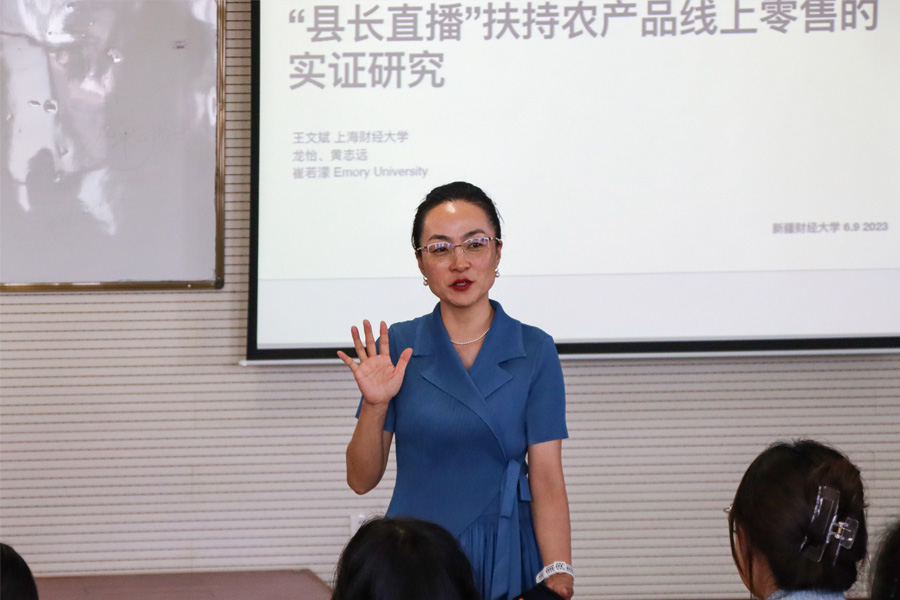 6月9日,我院邀请上海财经大学商学院运营管理系主任、商务分析研究中心主任王文斌教授(我院“小组团”援疆专家成员)开展学术交流活动,王文斌教授以《“县长直播”扶持农产品线上零售-一个基于因果机器学习的实证研究》为题作学术报告。我院全体教师、研究生100余人参加了报告会,学院党委副书记、院长王海芳教授主持此次学术报告会。