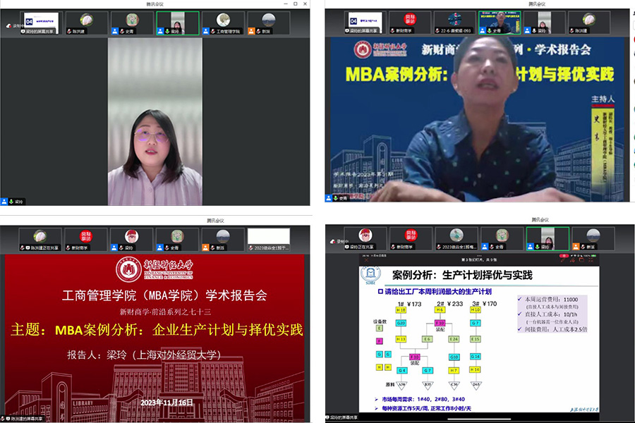 11月16日晚,工商管理学院(MBA学院)邀请上海对外经贸大学梁玲副教授/博士,以线上方式,为我院教师和MBA学生举办了题为“MBA案例分析:企业生产计划与择优实践”的学术讲座(新财商学·前沿系列之七十三)。我院师生170多人聆听了讲座,副院长史青教授主持讲座。