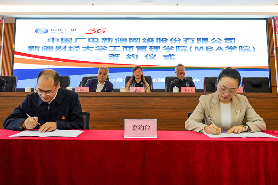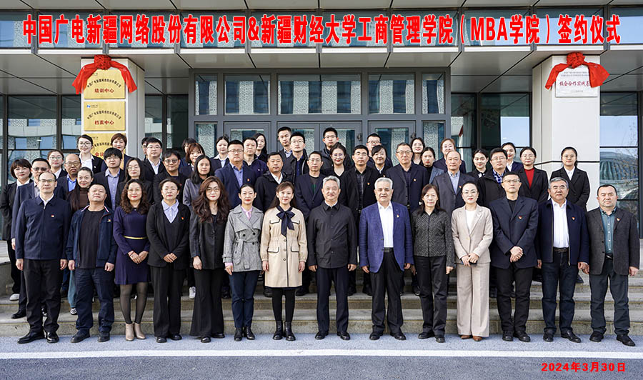 3月30日上午,工商管理学院(MBA学院)与中国广电新疆网络股份有限公司(简称新疆广电)校企合作实践基地签约仪式在新疆广电培训中心成功举行。校党委副书记王玉刚,工商管理学院(MBA学院)党委书记陈玉萍、院长王海芳、副院长史青、MBA中心主任李潇潇一行参加签约仪式。参加签约仪式的还有自治区广电局二级巡视员、人事处处长刘晓梅,新疆广电党委副书记、董事长吐尔洪·阿不力孜,新疆广电党委副书记、总经理陈长伟等。