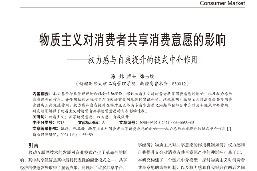您目前的位置: 首页» 科学研究» 科研成果» 陈炜博士的论文《物质主义对消费者共享消费意愿的影响——权力感与自我提升的链式中介作用》一文在《商业经济研究》发表