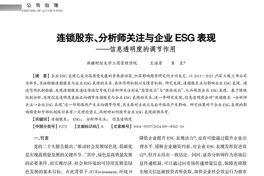 王海芳教授论文《连锁股东、分析师关注与企业ESG表现》一文在《会计之友》发表