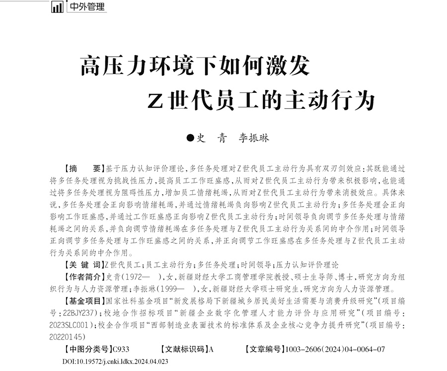 我院组织与人力资源管理系史青教授在核心期刊《领导科学》2024年第四期发表一篇论文,题目为:高压力环境下如何激发Z世代员工的主动行为。