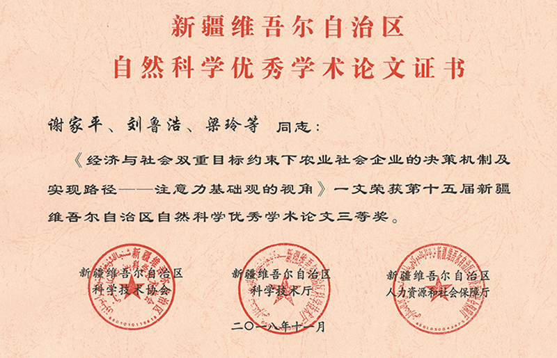 近日,自治区科协、科技厅、人社厅发文《关于第十五届自治区自然科学优秀学术论文评选结果的通报》(新科协发〔2018〕86号),我院天山学者谢家平等发表的《经济与社会双重目标约束下农业社会企业的决策机制及实现路径——注意力基础观的视角》一文荣获第十五届新疆维吾尔自治区自然科学优秀学术论文三等奖。