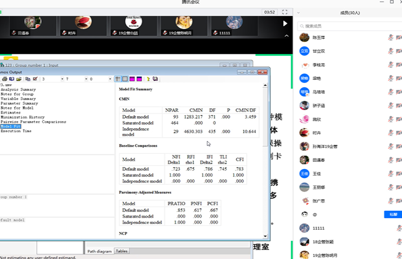 吴湘繁老师从“Item Parcel论文示例”、“为什么要进行Item Parcel”、“Item Parcel 在AMOS中的操作”以及“Item Parcel时的注意事项”等方面与在座及参加腾讯会议的线上老师、同学们进行了讨论。为了确保大家都能初步掌握Item Parcel的技术,吴老师现场运用AMOS软件对于单维构念的操作流程进行了示例操作,并说明了如何从理论上对比分析数据结果。