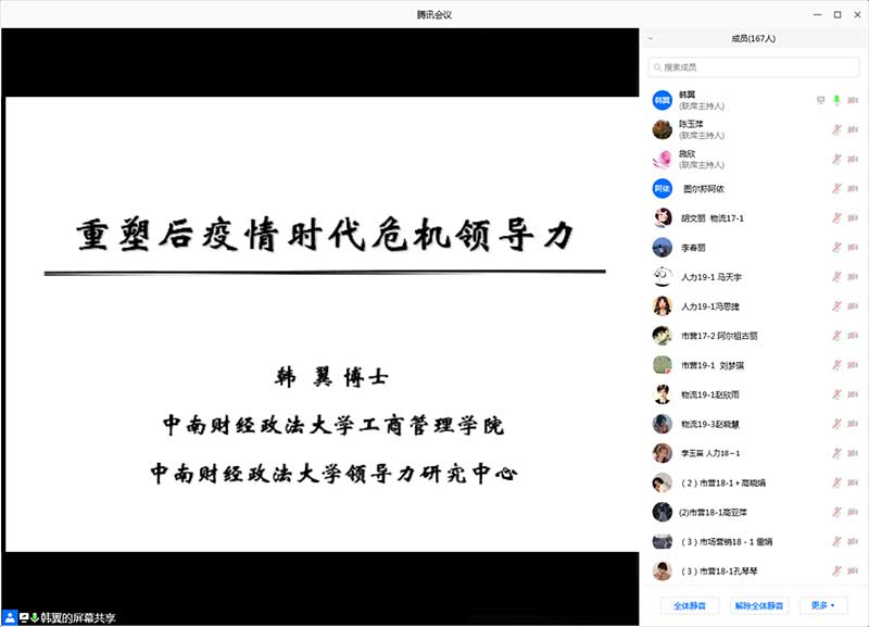 8月2日,我院2020年第19期学术报告会邀请中南财经政法大学韩翼教授做了题为“重塑后疫情时代危机领导力”学术报告,会议在腾讯在线网络会议室举行。上海财经大学博导、beat365天山学者特聘教授谢家平,我院教师、研究生、本科生及来自兄弟院校的师生,共170余人参加了报告会,院长陈玉萍教授主持了报告会。