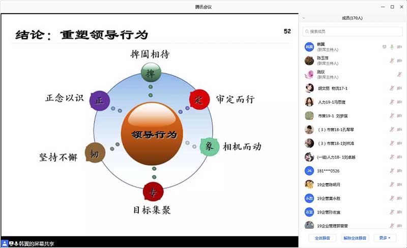 韩翼教授从武汉疫情切入,分三各方面阐述了危机领导力重塑:首先从新冠疫情出发,指出“危机=危+机”,进而分析了后疫情时代领导面临的8个挑战,即:怎样修复员工受伤的心、怎样保证员工的安全、企业战略是否面临重构、裁员还是裁业、是否共享员工、柔性上班取代正规上班、居家网络办公和人工智能化。提出领导者在应对危机时应具备的4R,即:缩减力、预备力、反应力和复原力。其次,韩翼教授认为“重塑=解构+重构”,重塑领导行为有6个方面,分别为:正念以识、捭阖相待、审定而行、目标集聚、相机而动和坚持不懈。最后,韩翼教授针对文化及其韧性在领导力的建设中的作用提出了自己的见解。