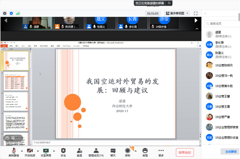 11月25日,我院邀请西南财经大学逯建教授做了题为“航空物流与我国经贸发展:回顾与建议”的学术报告(新财商学·前沿系列之一),会议在腾讯在线网络会议室举行。我院教师、研究生、本科生共90余人参加了报告会,副院长张晟义教授主持了报告会。