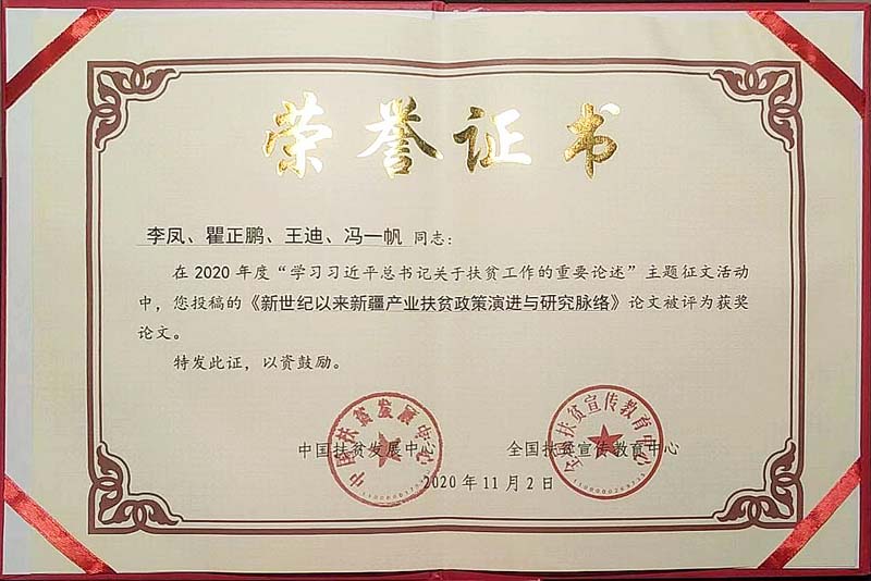 近日,工商管理学院李凤博士等撰写《新世纪以来新疆产业扶贫政策演进与研究脉络》一文,在2020年度“学习习近平总书记关于扶贫工作的重要论述”主题征文活动中评为获奖论文。