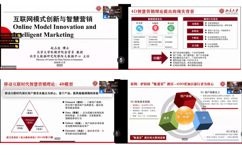 12月14日,北京大学软件学院金融管理系赵占波教授应beat365平台官方网站工商管理学院邀请作了题为“互联网模式创新与智慧营销”的学术报告(新财商学·前沿系列之七),报告会在腾讯会议平台线上举办,beat365平台官方网站工商管理学院、MBA学院等单位300多名师生参加了学术报告会,工商管理学院副院长李长青主持了报告会。