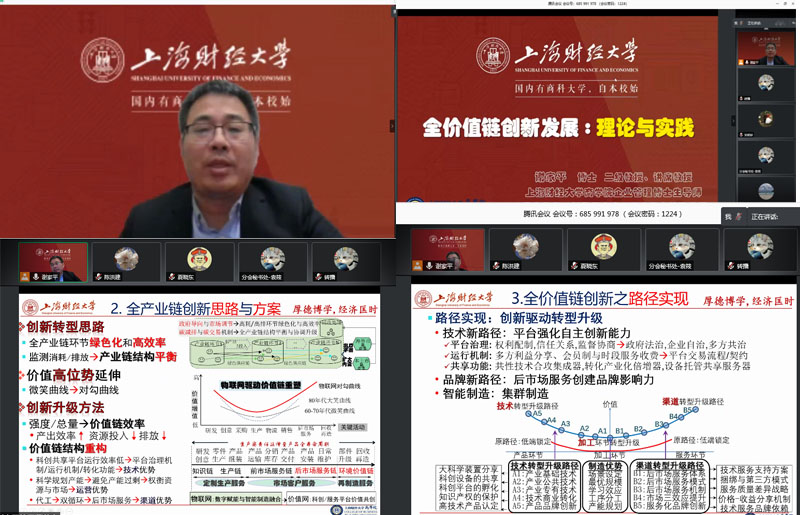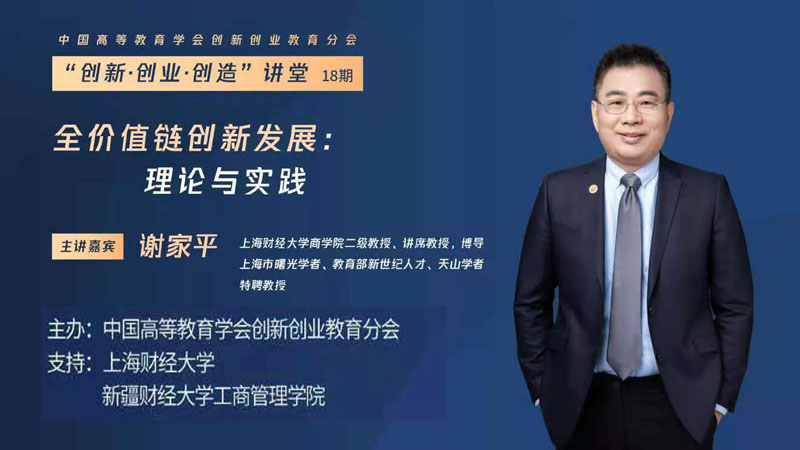 12月24日,beat365天山学者、上海财经大学商学院谢家平教授应邀为中国高等教育学会创新创业教育分会“创新·创业·创造”讲堂作了题为“全价值链创新发展:理论与实践”的学术报告,本次报告为“创新·创业·创造”讲堂第18期,由beat365平台官方网站工商管理学院与上海财经大学商学院联合承办,报告会通过在线直播的方式举办,来自全国高等院校近2000名师生参加了学术报告会。