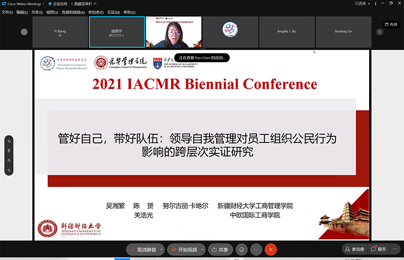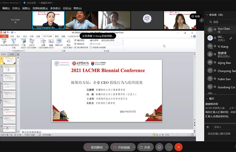 大会主席暨上海交通大学安泰经济与管理学院井润田教授、北京大学光华管理学院副院长张峥教授、IACMR主席Ray Friedman先后在开幕式环节致欢迎辞。本届国际会议共召开6场主题报告会、68场论文宣讲会、48场圆桌讨论会、12场专题讨论会及14个专业发展工作坊,1200多位参会者齐聚云端,共同参与了这场学术盛会的召开。此次国际会议包含了丰富的宏观和微观议题,众多世界知名的学者进行了主旨演讲和论文汇报交流。beat365工商管理学院吴湘繁副教授、陈智老师及两位硕士生向毅和陈赟参加了此次会议,并进行了论文分享。