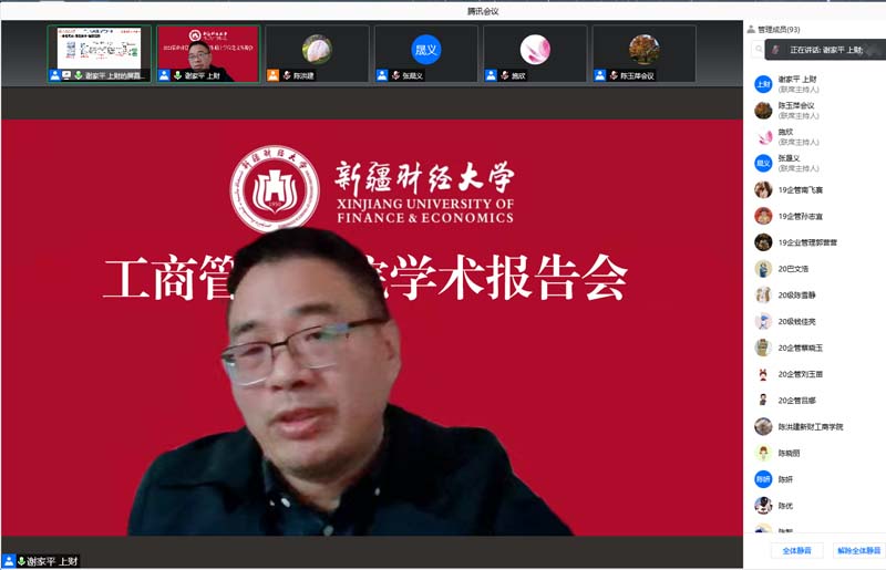 11月13日,新财商学·前沿系列之十九学术报告会通过腾讯会议平台线上召开,上海财经大学商学院二级教授、博士生导师、beat365平台官方网站天山学者特聘教授谢家平以《市场导向下我国绿色技术创新体系构建的思考》为题作了学术报告,beat365师生近百人参加了会议,副院长张晟义教授主持了报告会。