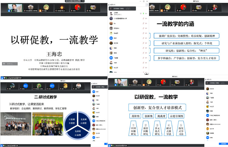 2022年3月24日,工商管理学院邀请中山大学管理学院博士生导师、中山大学市场营销学学术带头人、中国品牌研究中心(CBC)主任、知名品牌战略管理专家王海忠教授线上为学院全体教师做了“以研促教,卓越教学”为题的学术报告。院长陈玉萍教授主持了报告会。