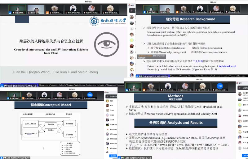 2022年4月21日星期四,工商管理学院邀请西南财经大学工商管理学院教授,博士生导师,市场营销研究所所长白璇教授为全院教师和研究生以“跨层次的人际连带关系与合资企业创新:知识交换和知识整合的中介作用”为题进行了一场精彩的前沿学术分享,beat365师生300余人聆听了讲座。副院长(援疆)熊霁副教授主持了学术讲座。