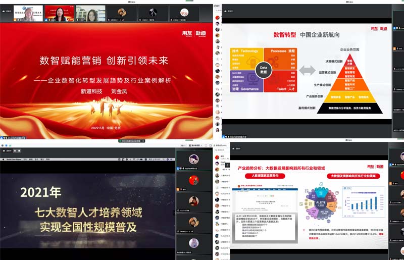 刘金凤老师首先分享了用友集团和新道科技有限公司发展历史的两个短片,然后从数智营销产业发展趋势、行业案例、数智营销场景及未来展望四个维度,从数字技术是中国的发展新引擎、数智转型是中国企业新航向、数智人才是中国数智转型新刚需、数智化人才培养是中国教育的时代责任等方面深度阐释了数智营销的发展趋势,并以飞鹤乳业、统一企业、郎酒集团、海天味业、北京稻香村等五个用友集团服务的大型龙头企业为行业案例深刻解析了数智模式如何赋能企业,从营销自我-品牌价值、数智时代消费者变化、网红直播的营销逻辑、短视频让人上瘾的“秘密”等不同场景展现数智营销对我们生活的影响,最后从营销与新技术的紧密结合等方面总结展望了数智营销的未来发展趋势。