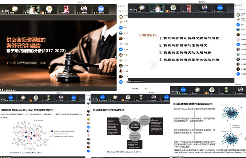 宋华教授结合自己的科研经历基于知识图谱分析,分别从供应链管理及其研究视角的演化、供应链管理中的案例研究、供应链管理研究的发展趋势以及供应链案例研究需要关注的问题等四个方面做了详细阐述。宋华教授不仅用各种数据和图表形象的描述了近五年供应链管理领域中的案例研究,也在研究主题、理论视角、案例研究样本和研究方法上给了老师和同学们非常实用的建议。宋华教授强调案例研究法的使用方面要找到适用的研究问题,案列研究分析过程一定要科学、严谨,案例分结论要与理论视角、理论框架和理论相呼应。