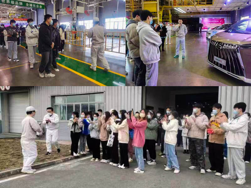 同学们在各车间负责人的引导下认识与了解了车企行业的生产过程,同时不断积极思考提出自己的想法。在冲压车间,大家认识了许多专业化设备,了解了其中生产的高效性;在焊装车间,这里的自动化程度已经达到了100%并见到了汽车的初始模样;来到总装车间,这里是每一辆广汽传祺车出产的最后一道生产线,采用AGV等自动化工具,大大提高了生产效率,给同学们展现了一个高科技自动化的生产线。最后,同学们参观了各类成品车的展览区,看到了广汽传祺的最新款汽车,大家纷纷上前体验驾驶与乘坐感受,感叹科技与汽车行业发展的速度!