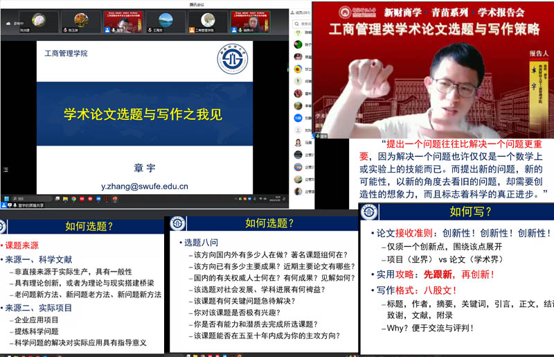 2023年4月20日下午,西南财经大学工商管理学院教授、博士生导师章宇教授受邀为我院师生进行了一场在线学术分享(新财商学·青苗系列之一),主题为《工商管理类学术论文选题与写作策略》。报告会吸引了全院200多名师生的参与,会议由熊霁副院长(援疆)主持。