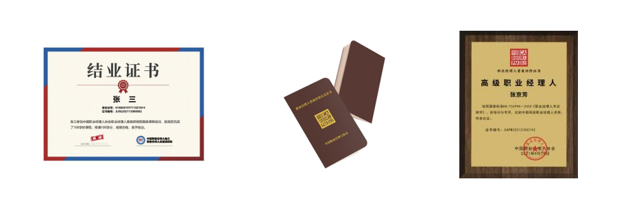 2.线下资质认证考核通过后,中国职业经理人协会颁发《中国职业经理人》资质证书、 铜牌证书 (仅限高级)。