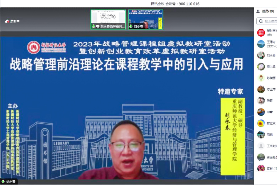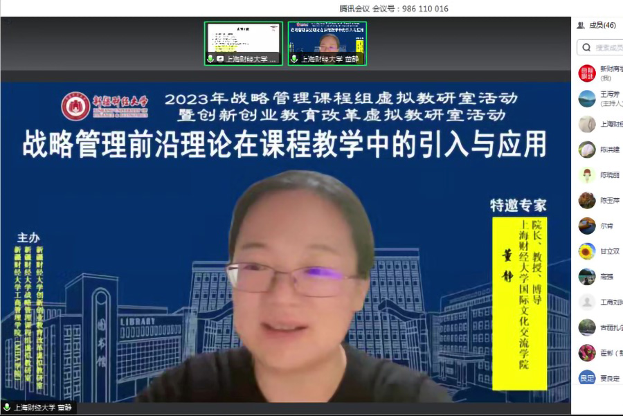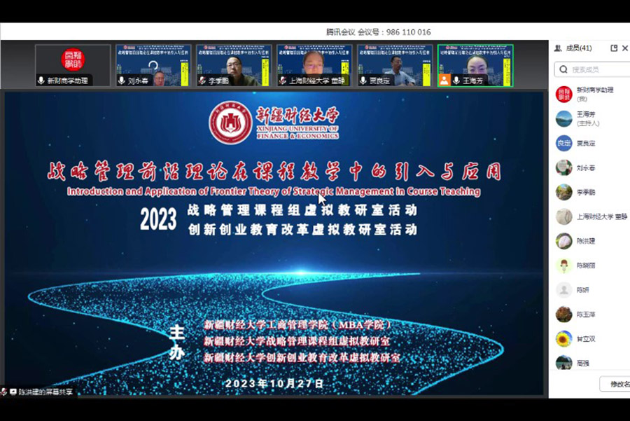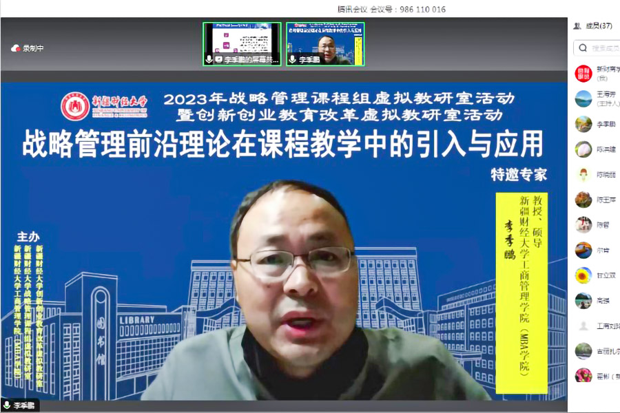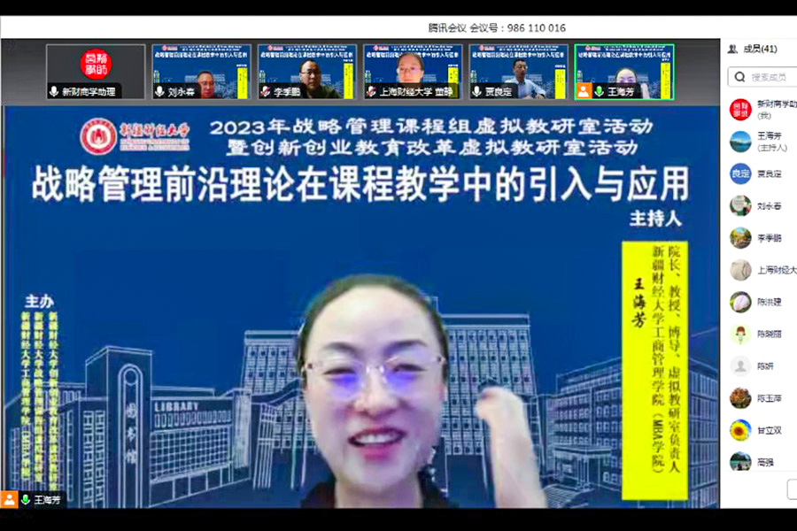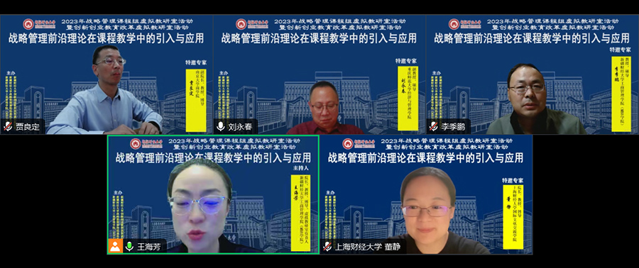 10月27日,我院战略管理课程组虚拟教研室与创新创业教育改革虚拟教研室共同举办了题为“战略管理前沿理论在课程教学中的引入与应用”的教研活动。上海财经大学国际文化交流学院院长、博士研究生导师董静教授,南京大学商学院副院长、博士研究生导师贾良定教授,重庆师范大学经济与管理学院刘永春副教授,beat365平台官方网站工商管理学院李季鹏教授等四位专家在会上作交流发言,教研活动通过腾讯会议进行,院长王海芳教授主持会议,学院教师线上参会学习交流。