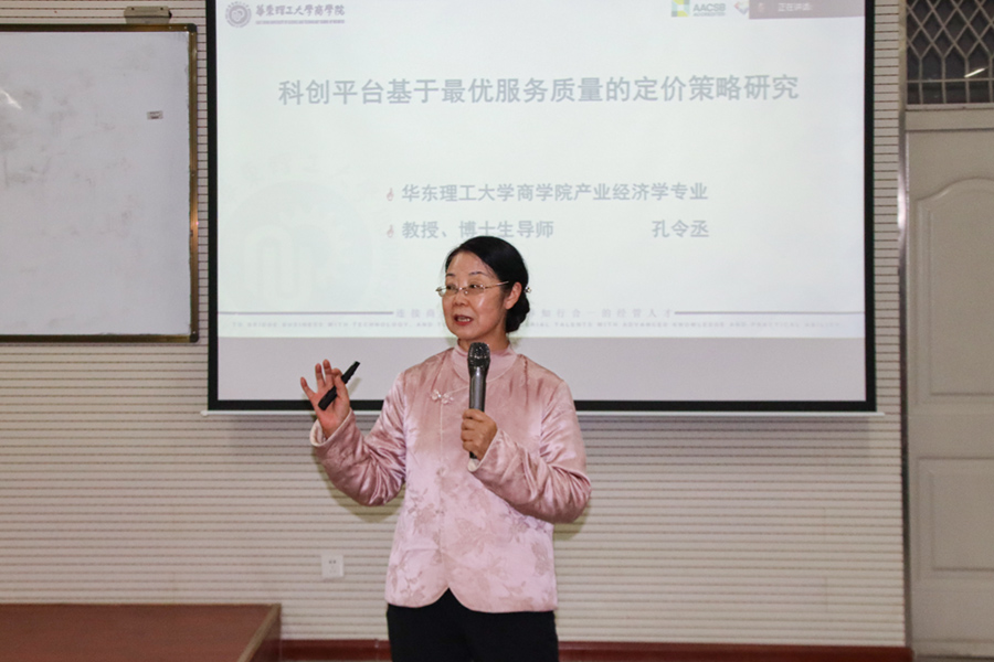 孔令丞教授以“科创平台基于最优服务质量的定价策略研究”为主题作主旨演讲。并为各位老师对发表理论论文方面提供了建设性意见。