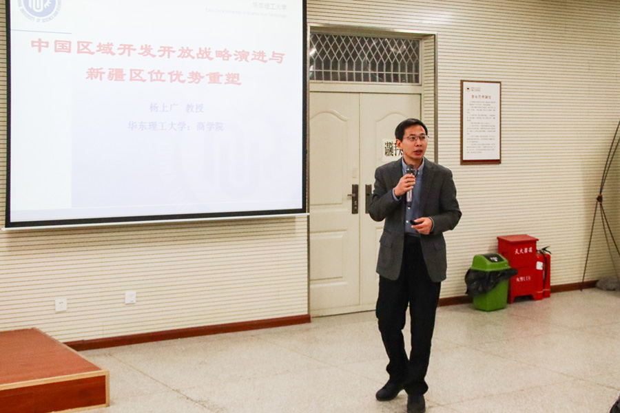 杨上广教授以“中国区域开发开放战略演进与新疆区位优势重塑”为题作了主旨演讲。他表示,中国应主动加速主导区域经济整合,提升中国的区域经济影响能力,对外开放,参与国际竞争,对内转型,摆脱对国际市场的过度依赖。汇报中就一带一路、自贸区建设等方面提出了自己的观点。