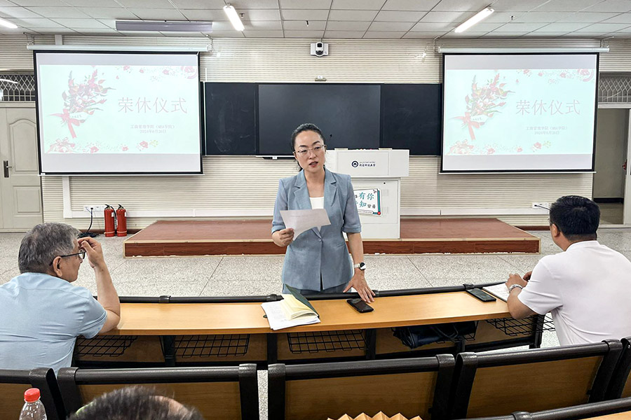 最后,工商管理学院(MBA学院)全体教职工与两位退休教师合影留念。在一片欢声笑语中,荣休仪式圆满落幕。两位退休教师带着满满的祝福和回忆,踏上了新的人生旅程。而工商管理学院(MBA学院)的全体教职工也将继续传承和发扬他们的教育精神,为学院的发展贡献自己的力量。