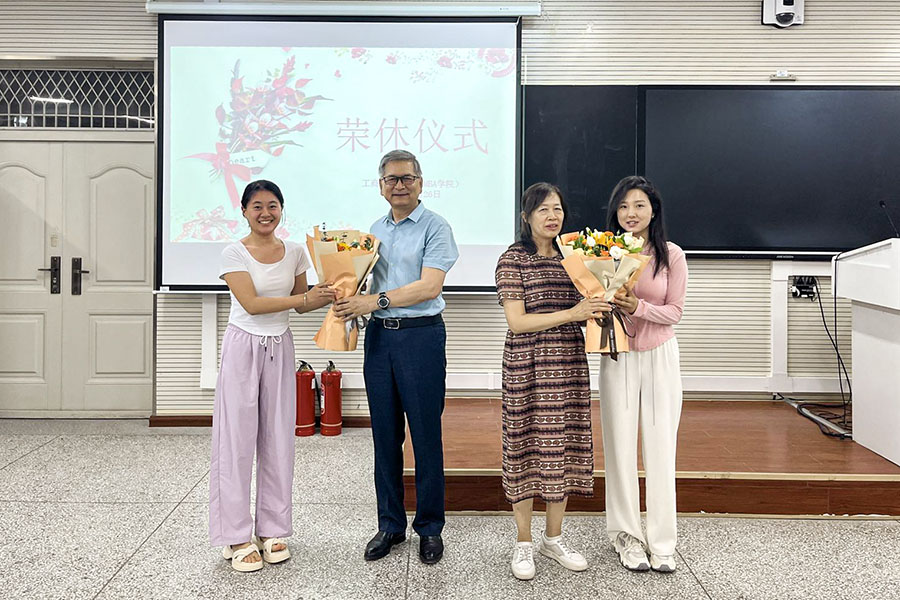 仪式第三项,学生代表们手捧鲜花,为陈玉萍教授和尔肯副教授献上最真挚的敬意。他们与两位教师合影留念,记录了这一难忘的瞬间。