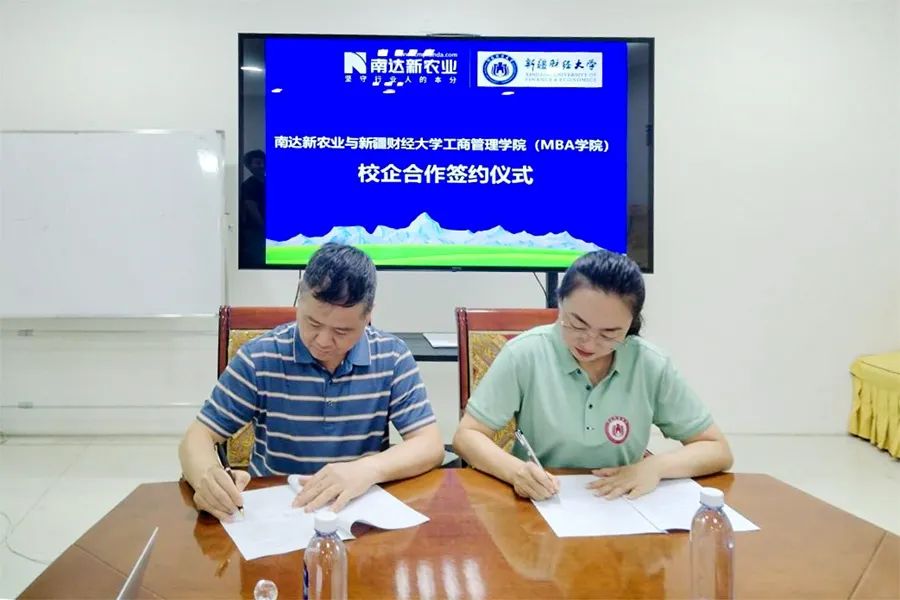 参加签约仪式的还有我院创新与战略管理系主任阿布力孜·布力布力副教授、南达新农业股份有限公司副总裁郝俊丽等。