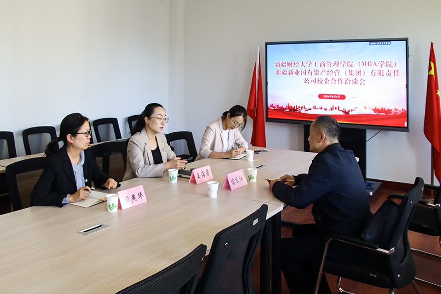 9月4日,新疆新业国有资产经营(集团)有限责任公司(以下简称新业集团)党委工作部部长苗东江莅临beat365平台官方网站工商管理学院(MBA学院)进行交流座谈。我院院长王海芳、副院长周燕华、创新与战略管理系副主任王丽娜参加了座谈,座谈会由王海芳主持。