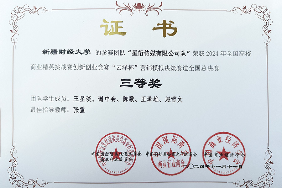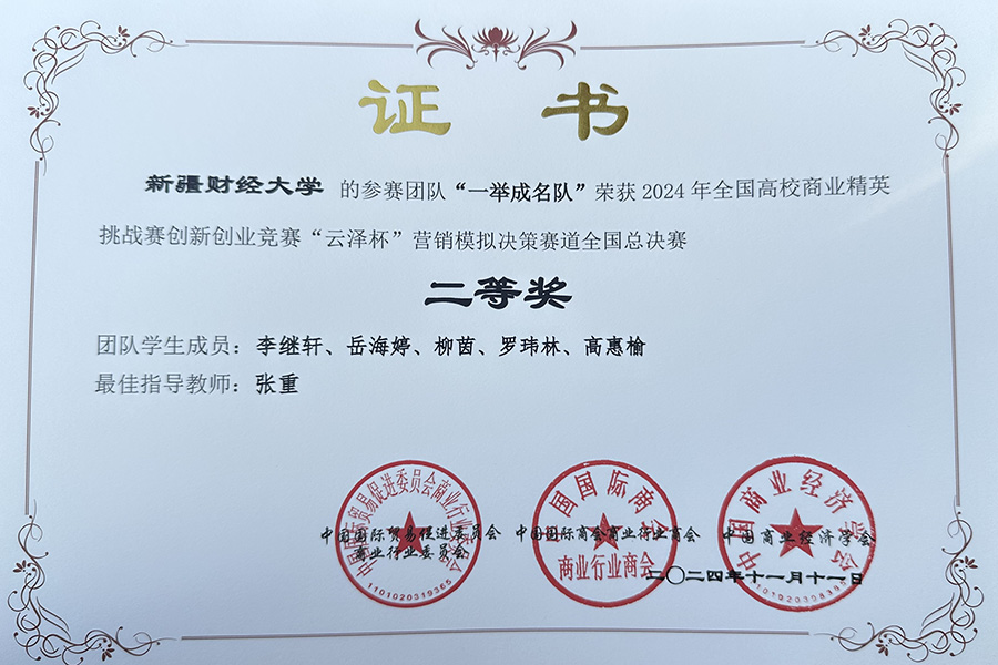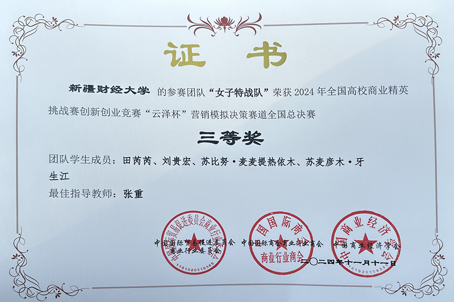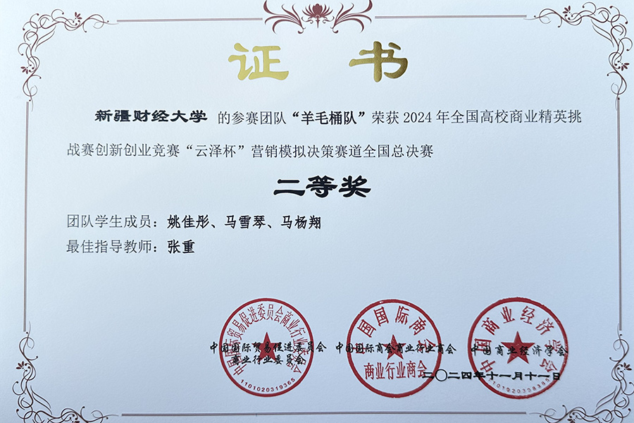 全国高校商业精英挑战赛创新创业竞赛“云泽杯”营销模拟决策赛是由中国国际贸易促进委员会商业行业委员会、中国国际商会商业行业商会、中国商业经济学会主办的国家级学科竞赛活动。本届竞赛共有来自全国30个省、直辖市、自治区的300余所院校,万余名师生参加,各参赛团队采用软件模拟经营的方式进行在线比拼,披荆斩棘,脱颖而出,最终我院4支团队获得国赛奖项,羊毛桶队(姚佳彤、马雪琴、马杨翔)、一举成名队(李继轩、岳海婷、柳茵、罗玮林、高惠榆)两个团队荣获全国二等奖;女子特战队(田芮芮、刘贵宏、苏比努·麦麦提热依木、苏麦彦木·牙生江)、星衍传媒有限公司队(王星琰、谢中会、陈歌、王泽雄、赵雪文)两个团队荣获全国三等奖。