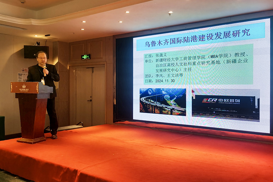 张晟义教授以《乌鲁木齐国际陆港建设发展研究》为题作主旨演讲。他阐述了乌鲁木齐国际陆港对于“一带一路”倡议及中欧班列的重要意义,重点介绍了乌鲁木齐国际陆港创新补载模式和智能监管方案以及国际陆港评价体系的完善。最后提出了促进国际陆港高质量发展和区域经济稳定的政策建议。