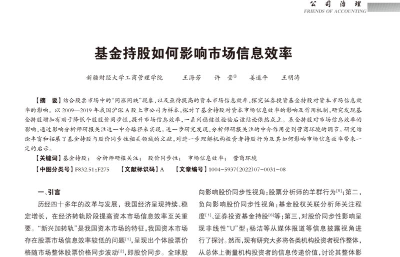 我院创新与战略管理系教授王海芳博士在核心期刊《会计之友》2022年第7期上发表一篇论文,题目为:基金持股如何影响市场信息效率。