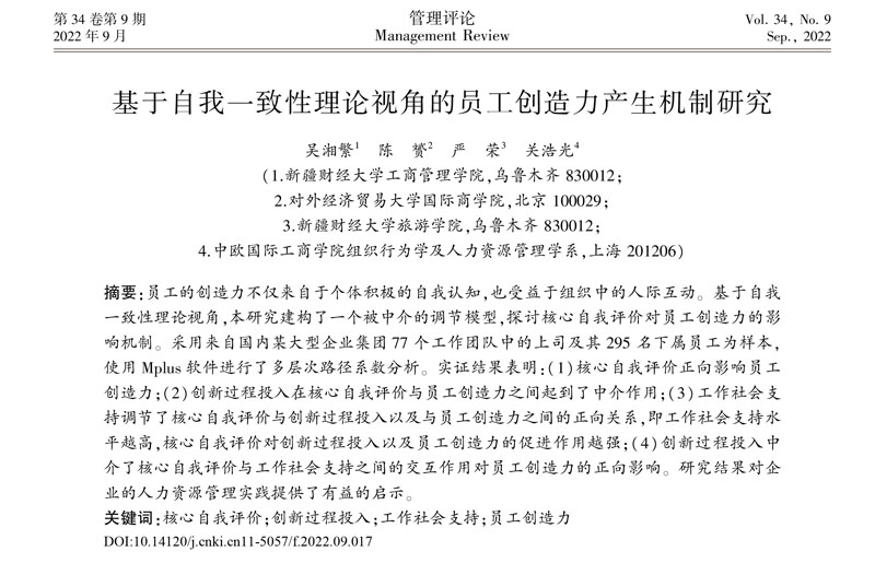 我院组织与人力资源管理系教授吴湘繁博士在B类核心期刊《管理评论》2022年第9期上发表一篇论文,题目为:《基于自我一致性理论视角的员工创造力产生机制研究》。《管理评论》也是国家自然科学基金委管理科学部认定的管理科学重要期刊(A类)之一。