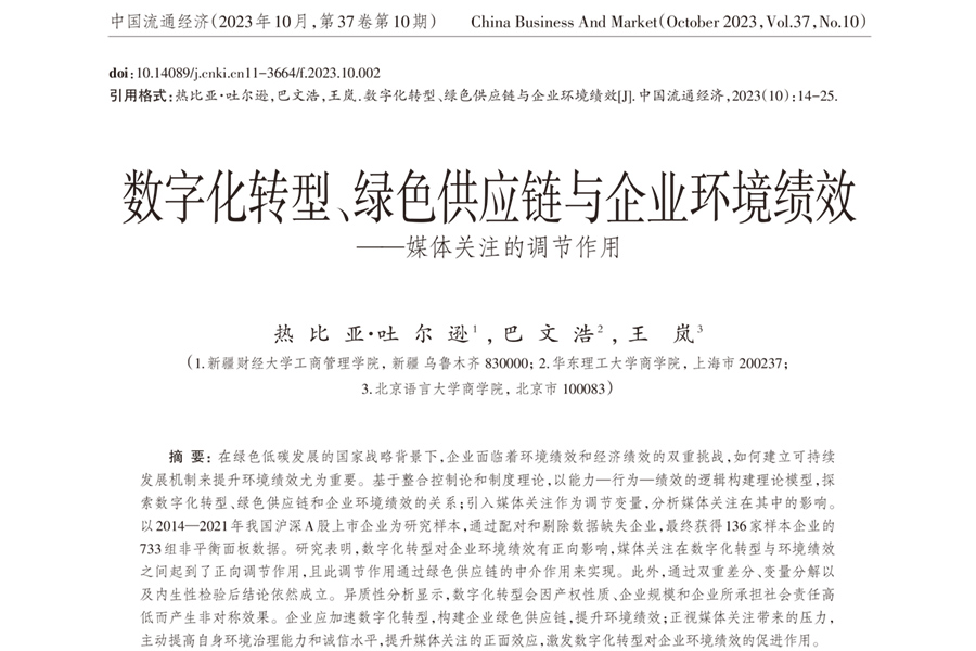 创新与战略管理系副教授热比亚·吐尔逊博士一作论文在核心期刊《中国流通经济》[北大核心][根据中国学术期刊影响因子年报(人文社会科学·2023版),《中国流通经济》复合影响因子为7.201]2023年10月发表,题目为:数字化转型、绿色供应链与企业环境绩效——媒体关注的调节作用。