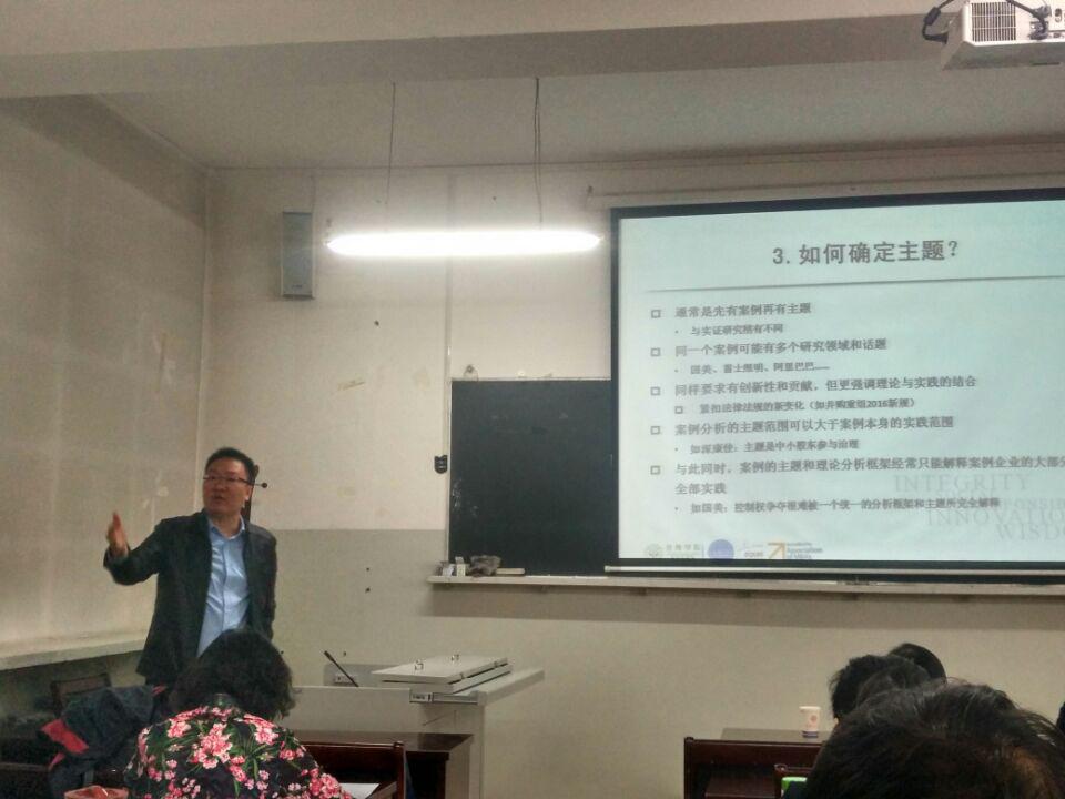 郑国坚现任中山大学管理学院副院长、教授、博士生导师,郑国坚教授的报告题目为:案例研究:从课堂报告到管理世界。讲座介绍了郑教授从学生的课堂报告入手指导学生深入研究分析并提炼升华最终发表在《管理世界》的案例。案例以股东权利的行使以及股东会议的表决制度为背景,结合深康佳中小股东维权的案例深入探讨了中小股东的对抗大股东维护自身权益的行为方式和影响。研究发现,深康佳维权事件起因在于大股东华侨城对中小股东的利益有极大的侵占,小股东运用累积投票制在股东大会击败大股东控股董事会,这也是我国证券史上中小股东首次控股董事会,但同时也探讨了由于中小股东的局限性而带来的隐患。
