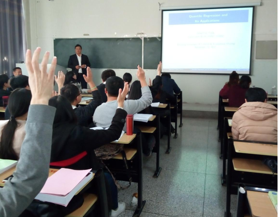 田茂再教授的学术报告主要对分位数回归模型作了详细的介绍,并对其未来的发展作了展望。他列举了分位数回归在金融、人口、资源等方向的具体应用,使大家对相关内容有了更加深刻的认识。并就师生提出的问题做了详细的解答。