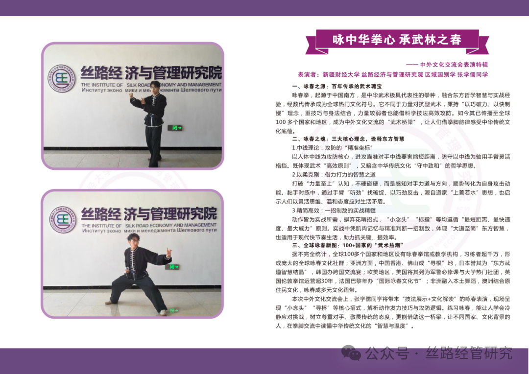 期间,我院还同步向CAREC学院的领导、老师及国际友人发放了咏春中英宣传手册,进一步丰富了文化传播载体,让咏春文化的历史脉络与武学智慧更直观地触达国际友人。