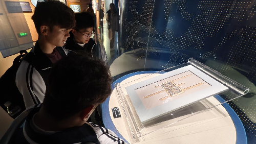 在“锦绣中华”国宝展区,同学们重点观摩“五星出东方利中国”锦护臂: