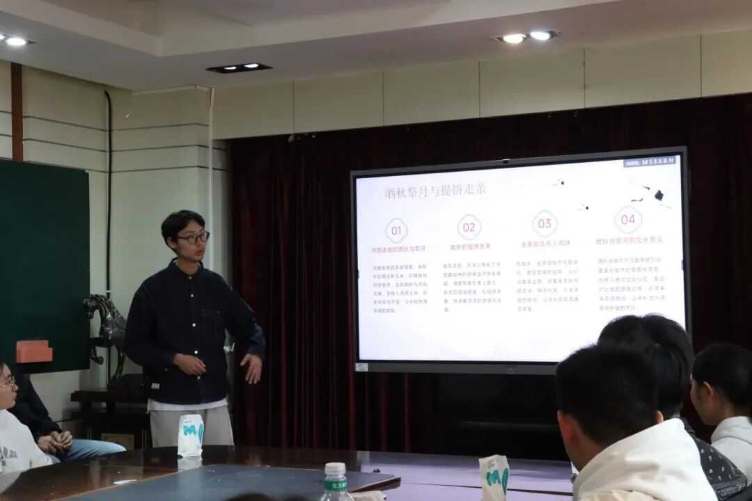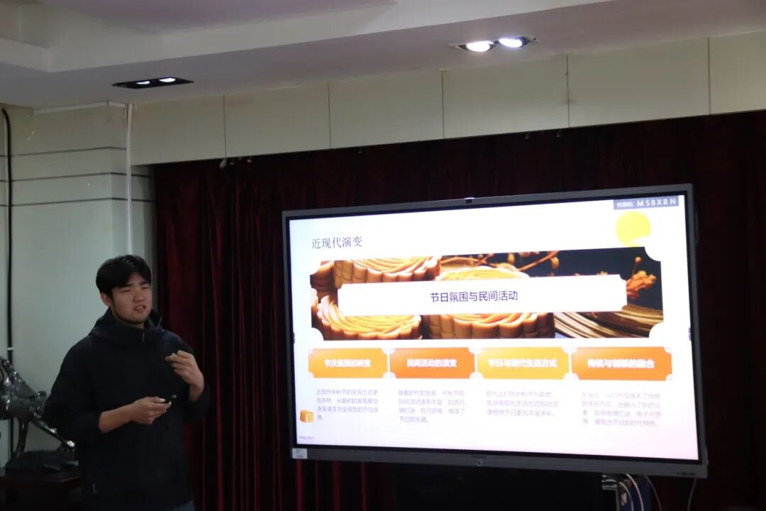 随后,两位同学依次上台分享。他们不仅详细介绍了中秋节的起源、传统习俗等文化知识,还结合自身经历,生动讲述了家乡过中秋的独特方式——从家人团聚时的特色宴席,到赏月、猜灯谜等趣味活动,让在场师生感受到不同地域中秋文化的魅力,也唤起了大家对家乡的思念。