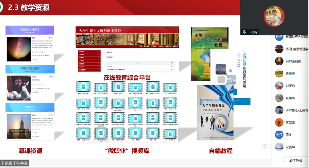 在谈到课程建设时,王龙淼老师以石河子大学“大学生职业发展与就业指导”课程改革及建设为例,介绍了学校在课程目标设定、模块化教学改革、实践教学强化、师资队伍培养等方面的探索。此外,他还分享了学校在推动基层就业、深化校企合作、建设专业化团队等方面的典型做法与成效。